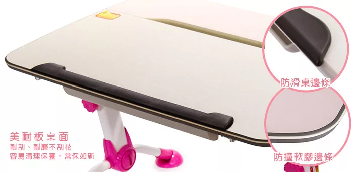 兒童書桌側邊,以圓弧及曲線設計,配合『軟膠邊條』保護桌邊,讓桌面無銳角,使用上安全、更具親和力。