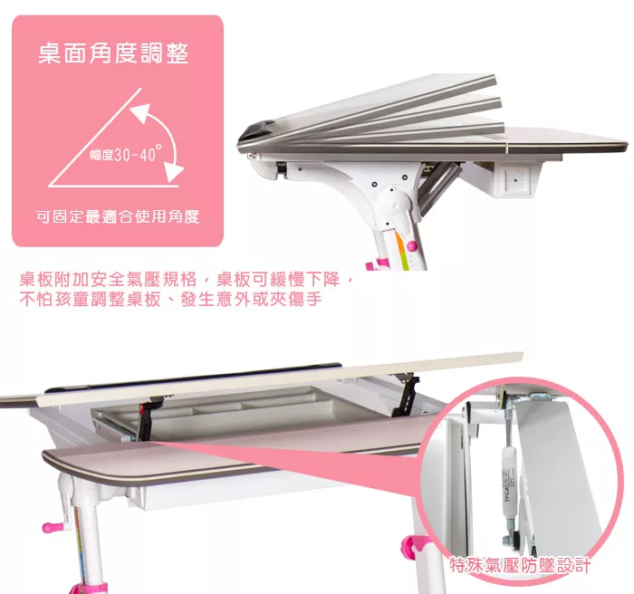 桌板可五段式調整桌面角度,最大約30度左右,並設計緩衝氣壓規格,當桌面放置最高時,會自動慢慢下降,不怕因調整過程,桌面瞬間墬落,導致手夾傷等意外。