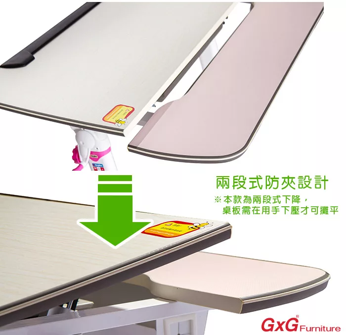 本款特別設計前桌板下降時,會停止再一定的高度,需大人將桌板下壓,才可攤平,避免孩童自己使用桌板傾斜功能夾傷。