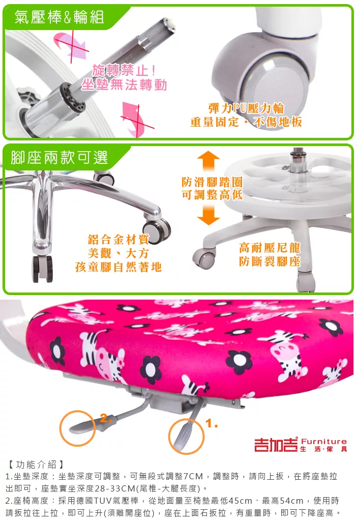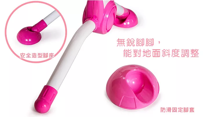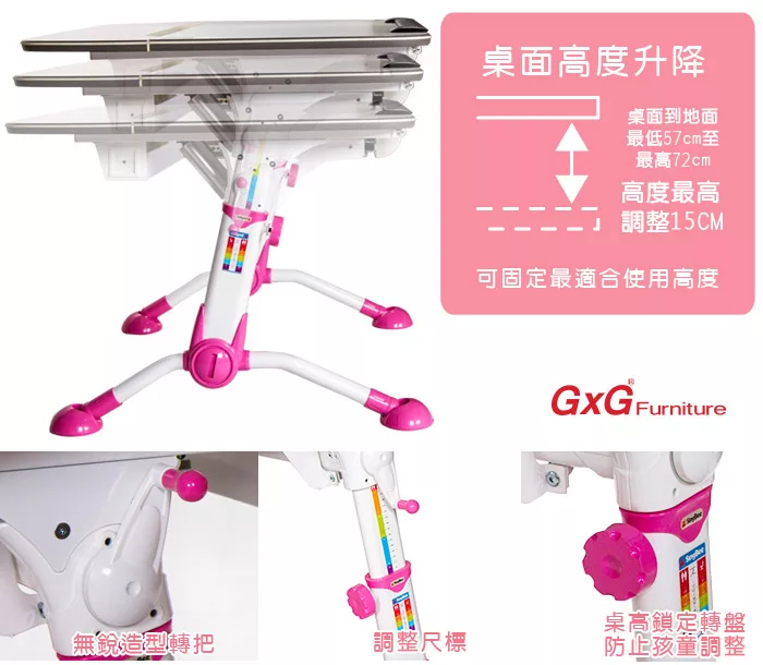 活潑色彩搭配圓弧曲線造型,增添居家時尚感,全新『轉桿調整機構』,方便高度調整,桌面可隨孩童成長高度進行調整,桌面更有『五段式傾斜功能』。