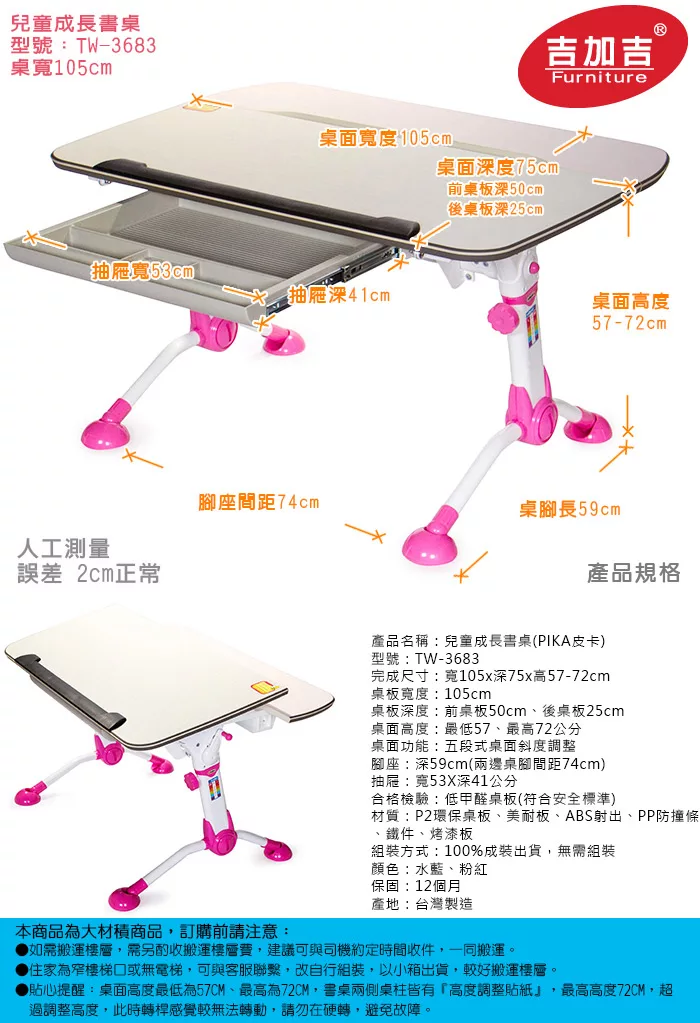 本款TW-3683桌寬105cm,提供粉紅、水藍色可選。
