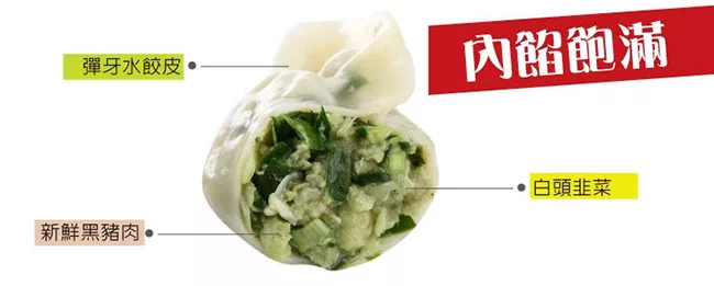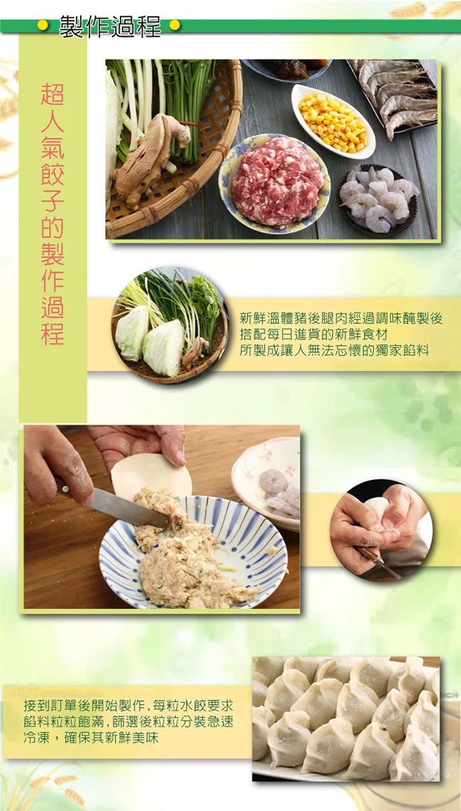 接到訂單後開始製作,每粒水餃要求餡料粒粒飽滿,篩選後粒粒分裝急速冷凍,確保其新鮮美味!新鮮溫體豬後腿肉經過調味醃製後搭配每日進貨的新鮮食材所製成讓人無法忘懷的獨家餡料